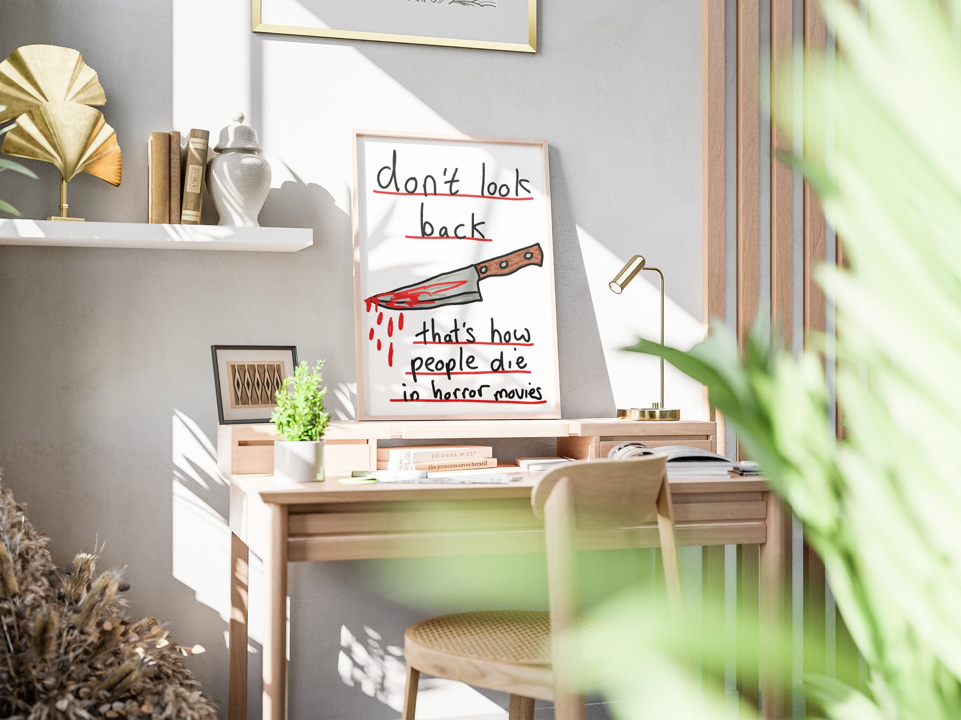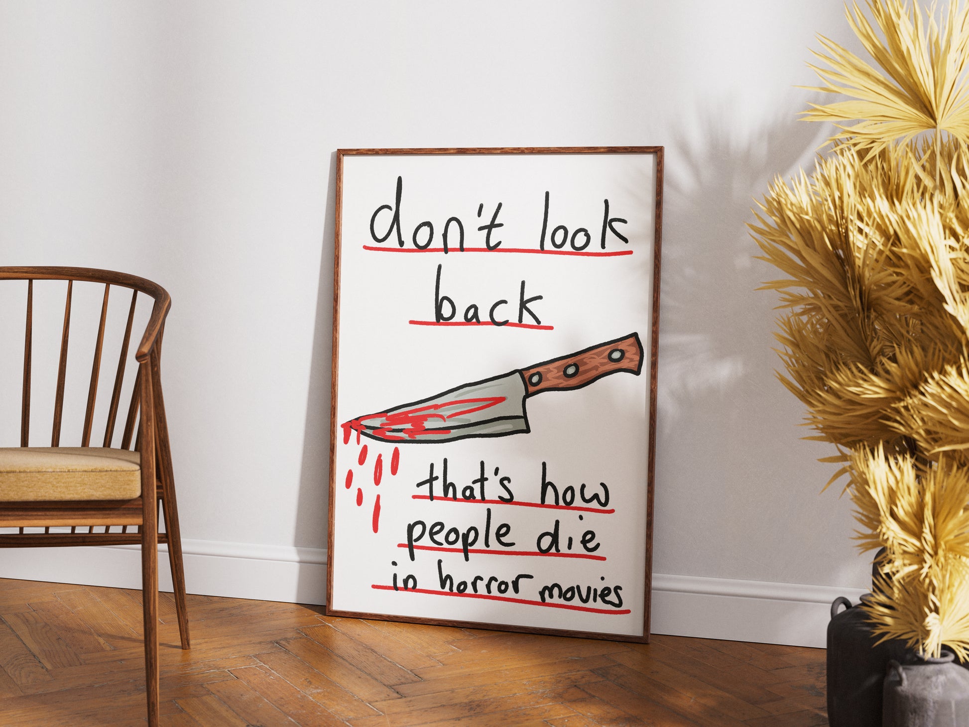 "Don’t Look Back (That’s How People Die in Horror Movies)" is a darkly humorous print that blends wit with a touch of menace - featuring a single, bloodied knife rendered in loose, expressive linework.
