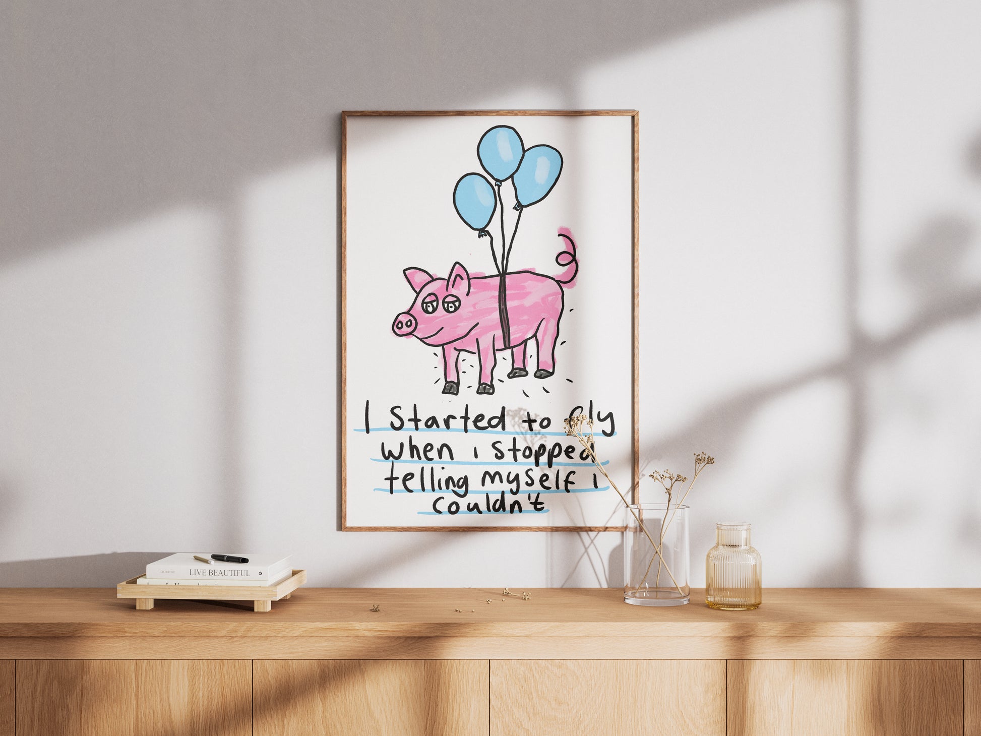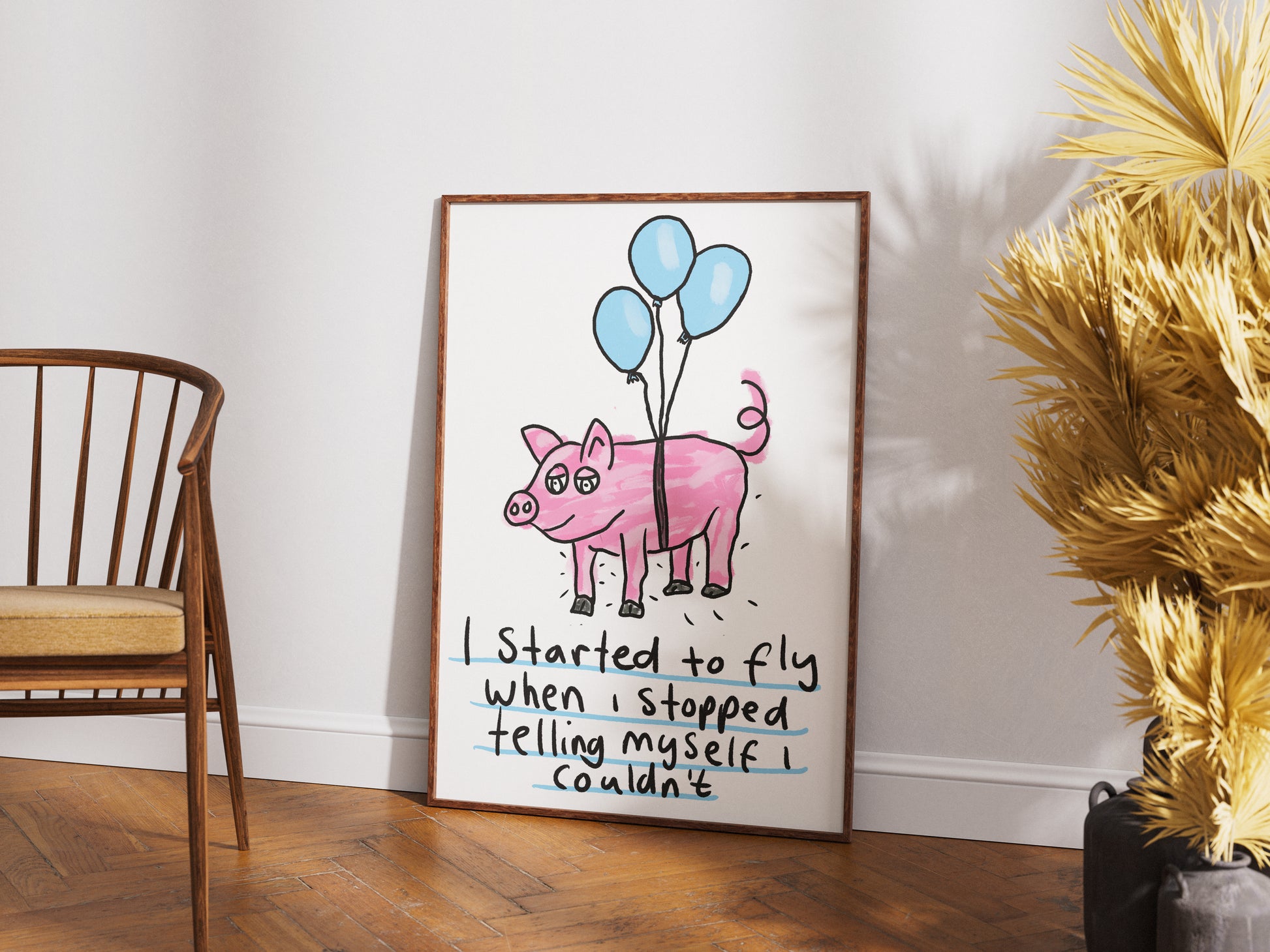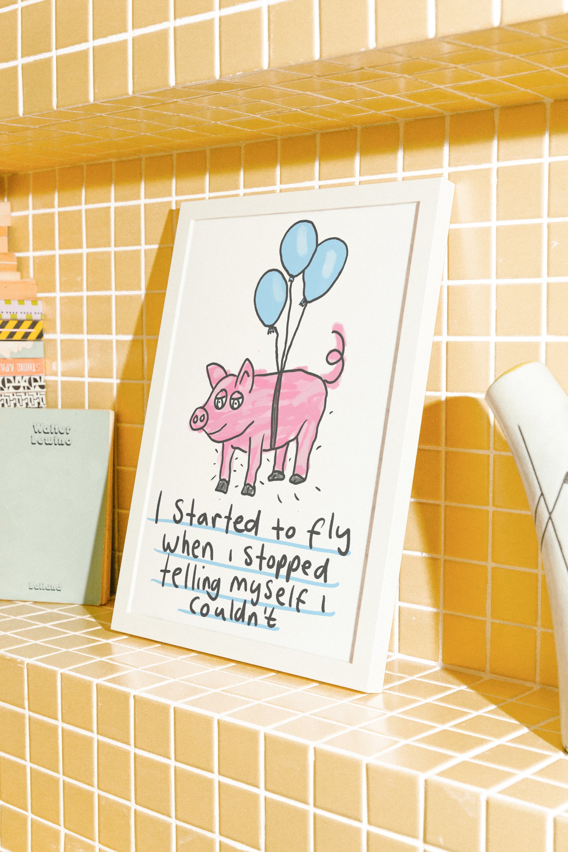 "I started to fly when I stopped believing I couldn't" is a playful yet hopeful print featuring a pig being gently lifted into the sky by a bunch of balloons. Both whimsical and inspiring, it’s a reminder that the limits we place on ourselves aren’t always real - sometimes letting go of doubt is the first step to soaring.